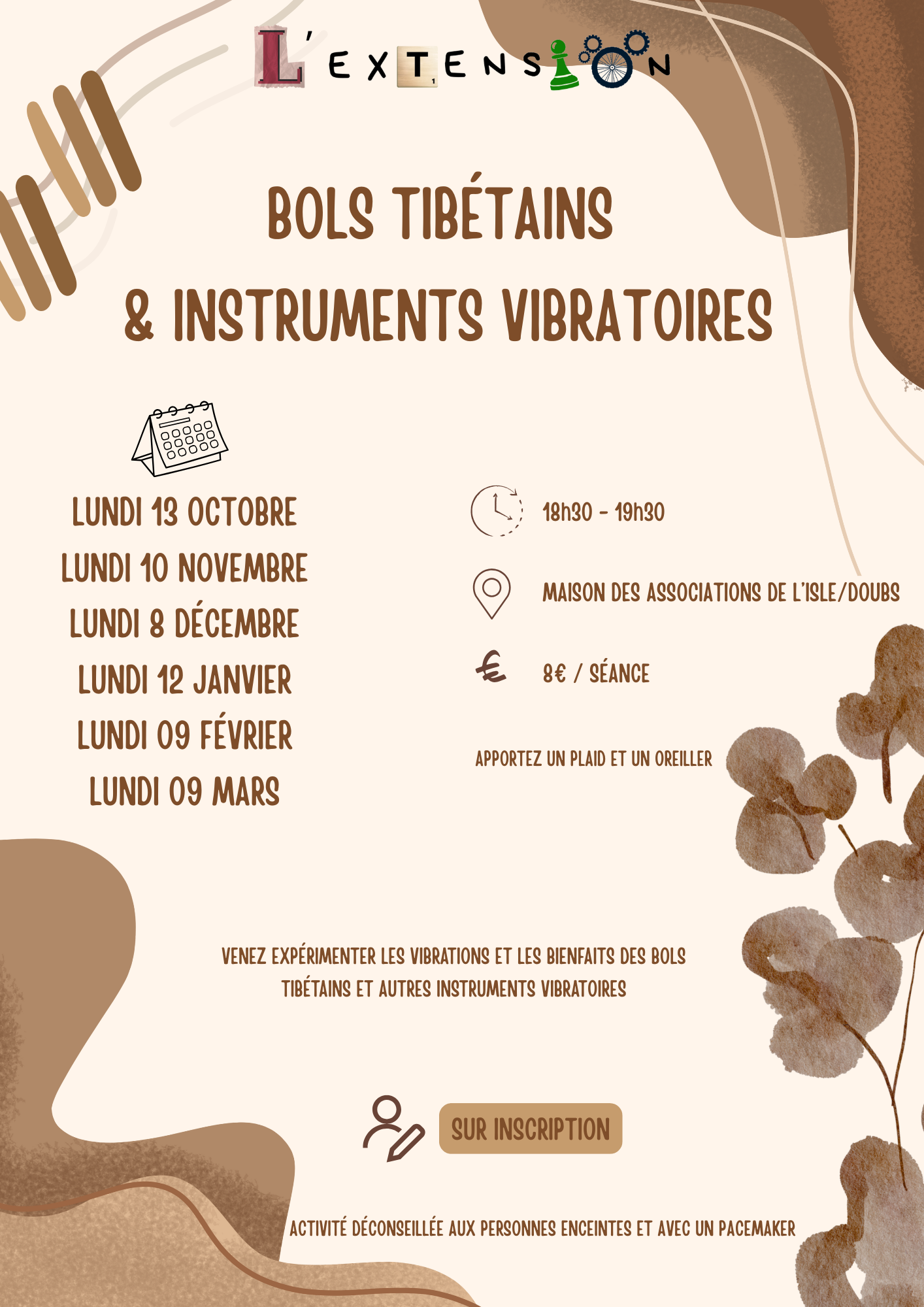 Confortablement installés, venez expérimenter les vibrations et les bienfaits des bols tibétains et autres instruments vibratoires... et même participer si vous le souhaitez.