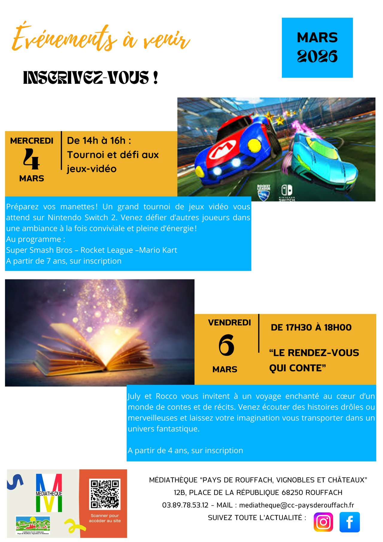 Tournoi jeux-vidéo le  4-03-2026 de 14h à 16h sur inscription à la médiathèque de ROUFFACH