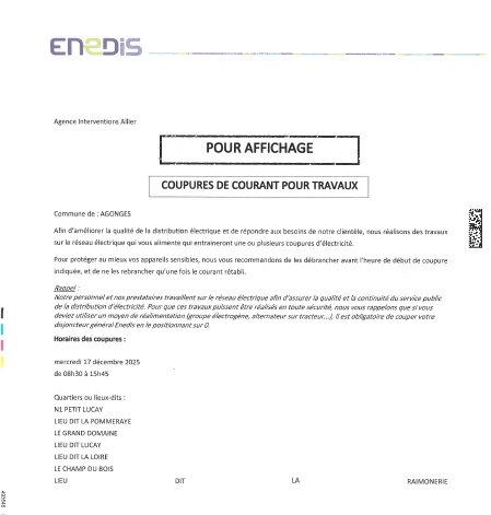 Le mercredi 17 décembre 2025 de 8h à 17h, des coupures de courant sont prévues en raison de travaux.