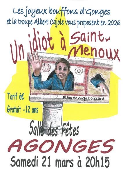 La troupe "Les joyeux bouffons d'Gonges" et la troupe Albert Cajole s'associent pour vous proposer la pièce "Un idiot à Saint-Menoux".