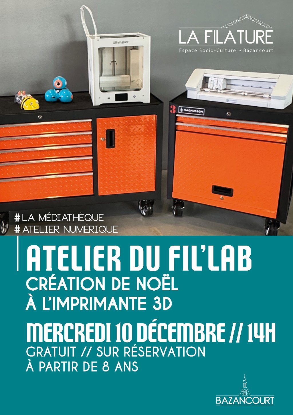 La Filature s’est équipée de son Fil’Lab, dédié à la création numérique et équipé d’outils variés tels qu’une découpeuse vinyle, une imprimante 3D, des robots, des cartes électroniques, des tablettes, une badgeuse, et bien plus encore.