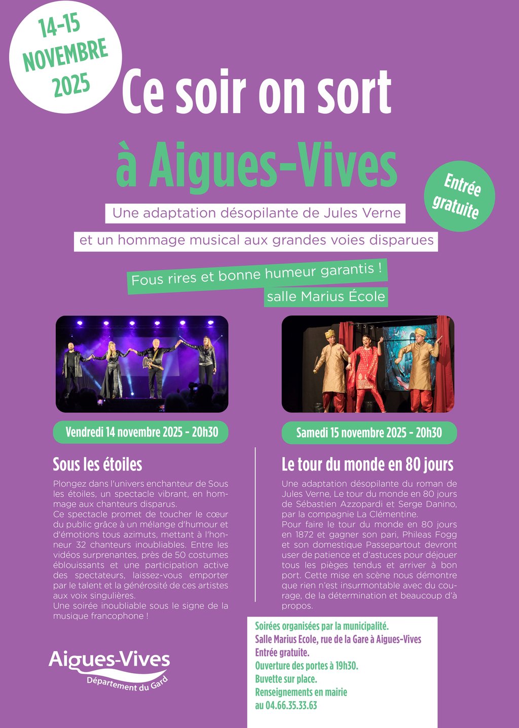 🌟Ce soir, on sort à Aigues-Vives ! Deux soirées théâtre offertes par la municipalité 🎭 L'équipe municipale vous invite à deux spectacles, le vendredi 14 et le samedi 15 novembre. Venez profiter de ces moments conviviaux en famille ou entre amis.