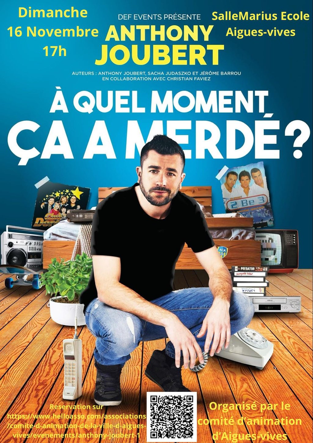 Venez retrouver Anthony Joubert, célèbre humoriste arlésien, dans son spectacle "à quel moment ça a merdé" dans lequel il aborde sa vie (notre vie) avec ses yeux d'adulescent.