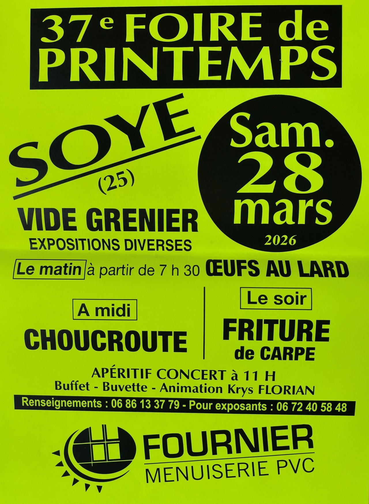 La commune de Soye organise sa traditionnelle Foire de Printemps le samedi 28 mars 2026. Cet événement phare de la vie locale rassemble chaque année de nombreux visiteurs autour d'animations variées.