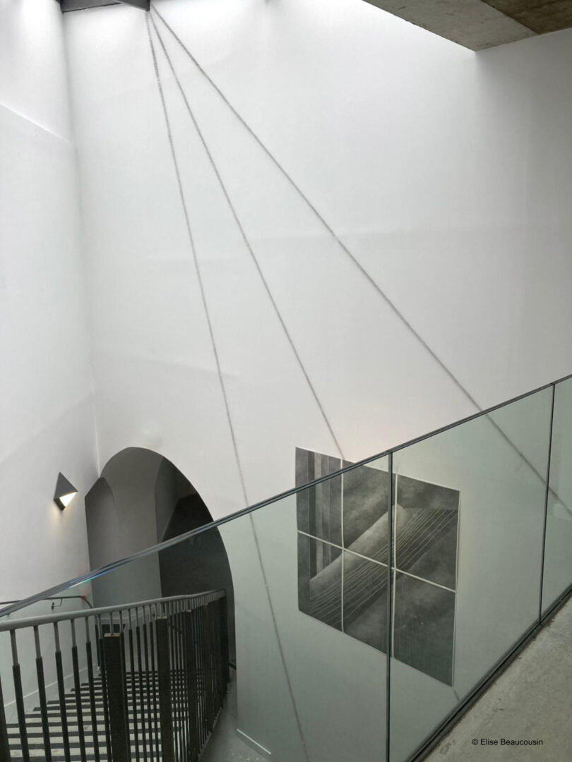 Élise Beaucousin déploie Dessin d’acier en deux temps. À l’intérieur du château de Châteaufer, l’installation dialogue avec la douceur de la texture des murs et les fresques restaurées. À l’extérieur, elle investit un bâtiment agricole visible depuis une fenêtre. Des épingles d’acier étêtées fichées dans les murs interagissent avec la lumière naturelle, se métamorphosant au fil du jour et créant une continuité avec le paysage.