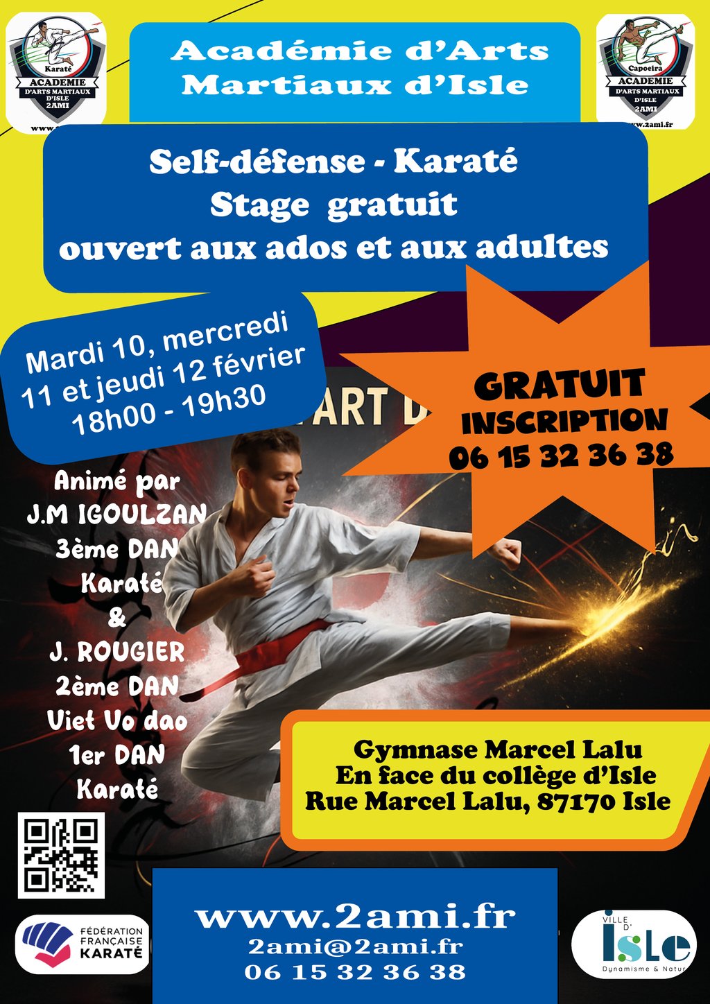 Stage gratuit de self-dĂ©fense et de karatĂ©, ouvert aux adolescents et aux adultes, proposĂ© par lâAcadĂ©mie dâArts Martiaux dâIsle.