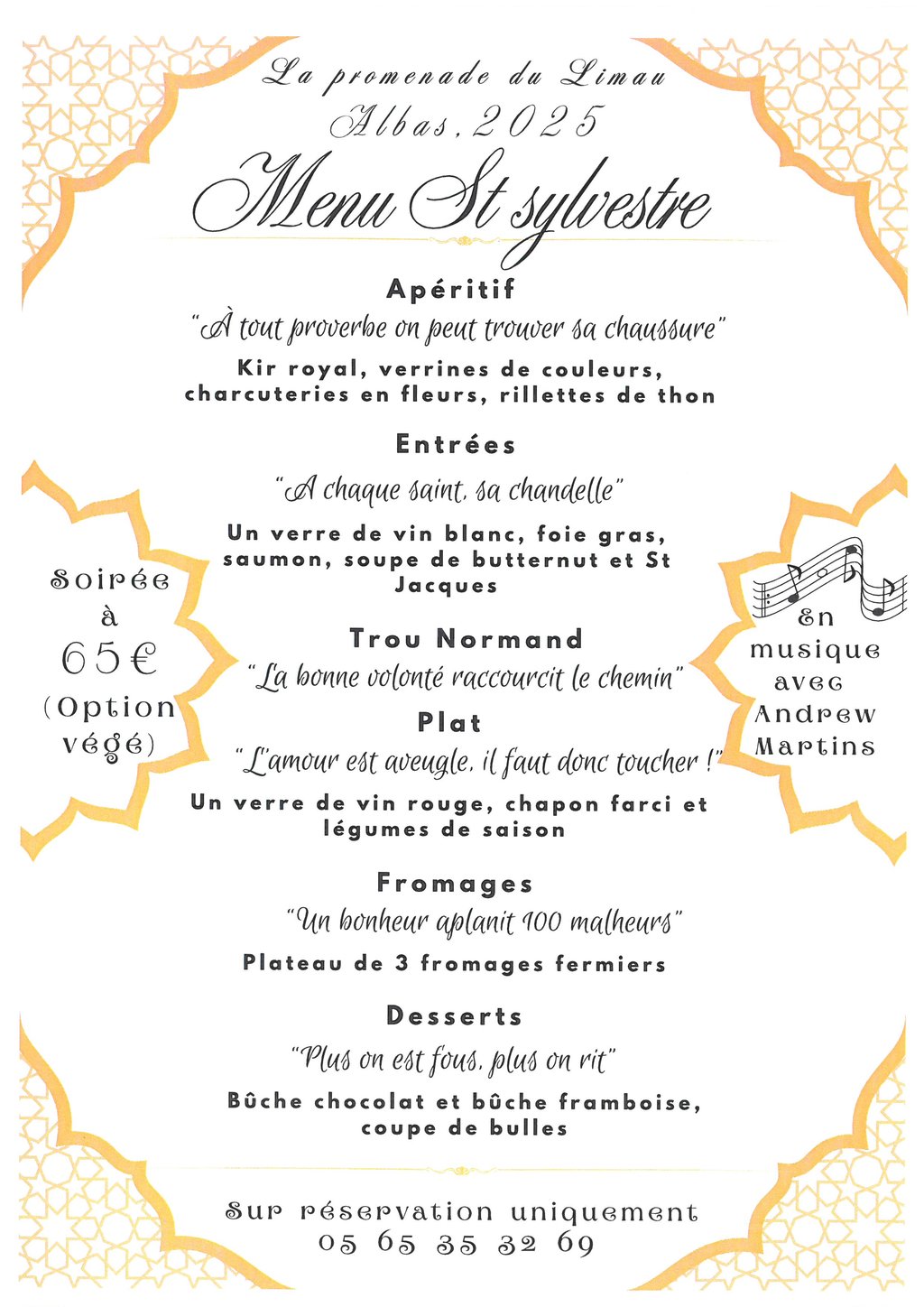 La Promenade du Limau propose repas de réveillon de la 𝐒𝐚𝐢𝐧𝐭 𝐒𝐲𝐥𝐯𝐞𝐬𝐭𝐫𝐞 pour fêter le passage à l’année 𝟐𝟎𝟐𝟔, dès 20H.