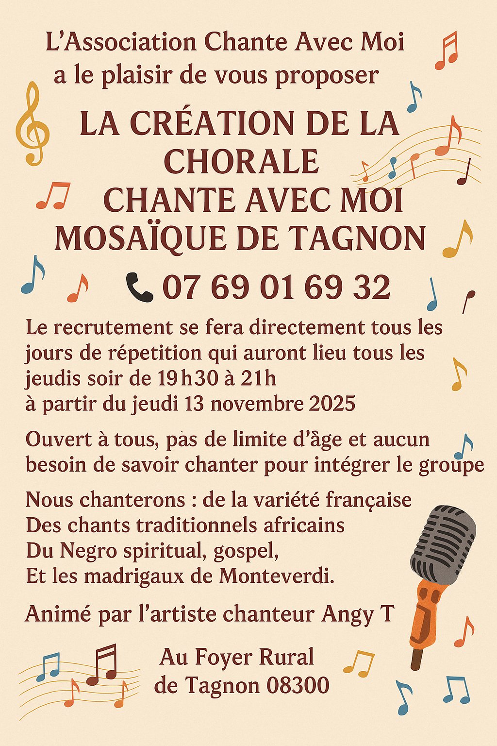 L’association Chante avec moi a le plaisir de vous proposer la création de la chorale "Chante avec moi Mosaïque de Tagnon"