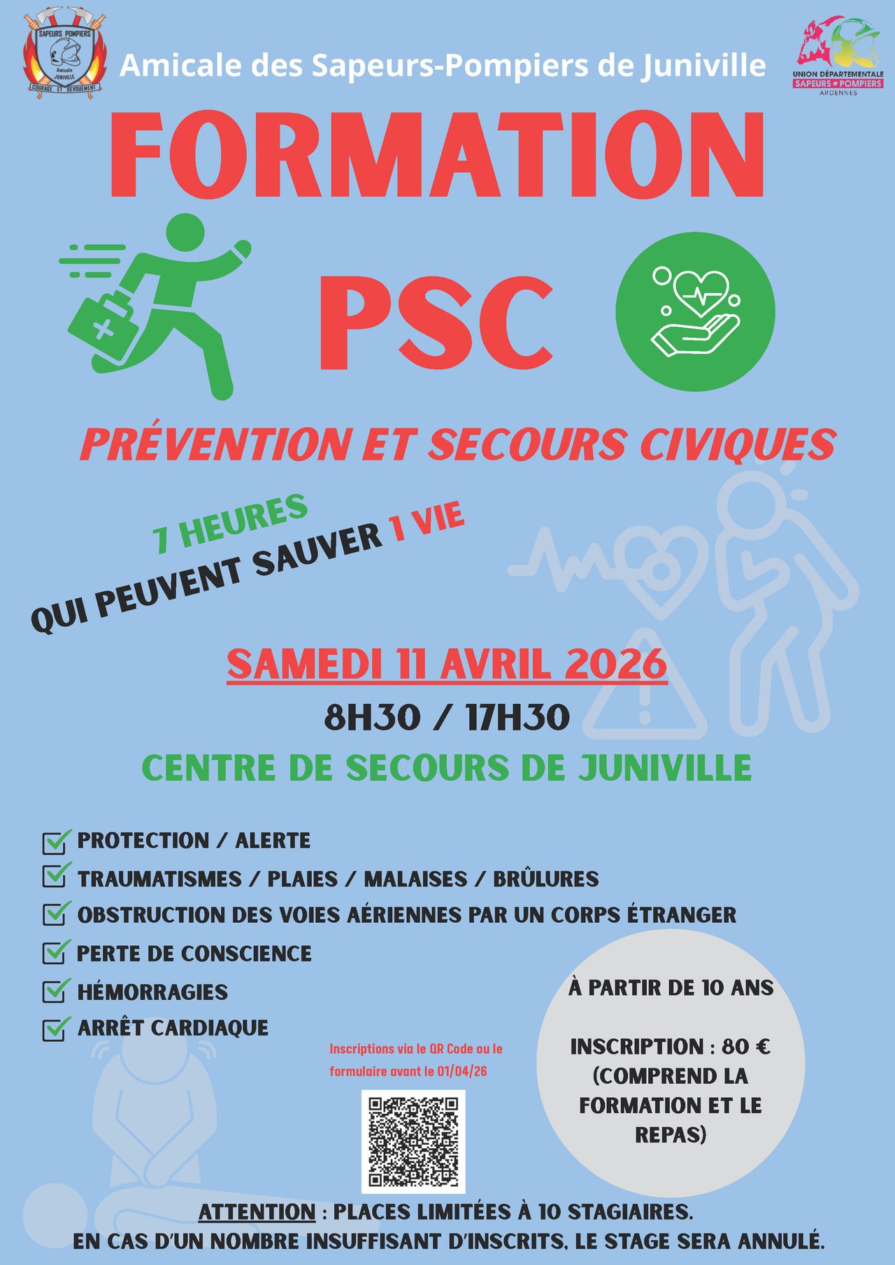 L'amicale des Sapeurs-Pompiers de Juniville organise une session de formation PSC (Premiers Sécours CItoyen) le samedi 11 avril prochain à la caserne de Juniville.