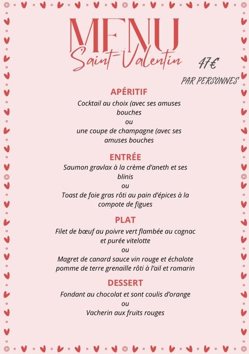 Pour la Saint-Valentin, notre chef vous propose un menu gourmand et raffiné à savourer dans une ambiance chaleureuse et romantique.