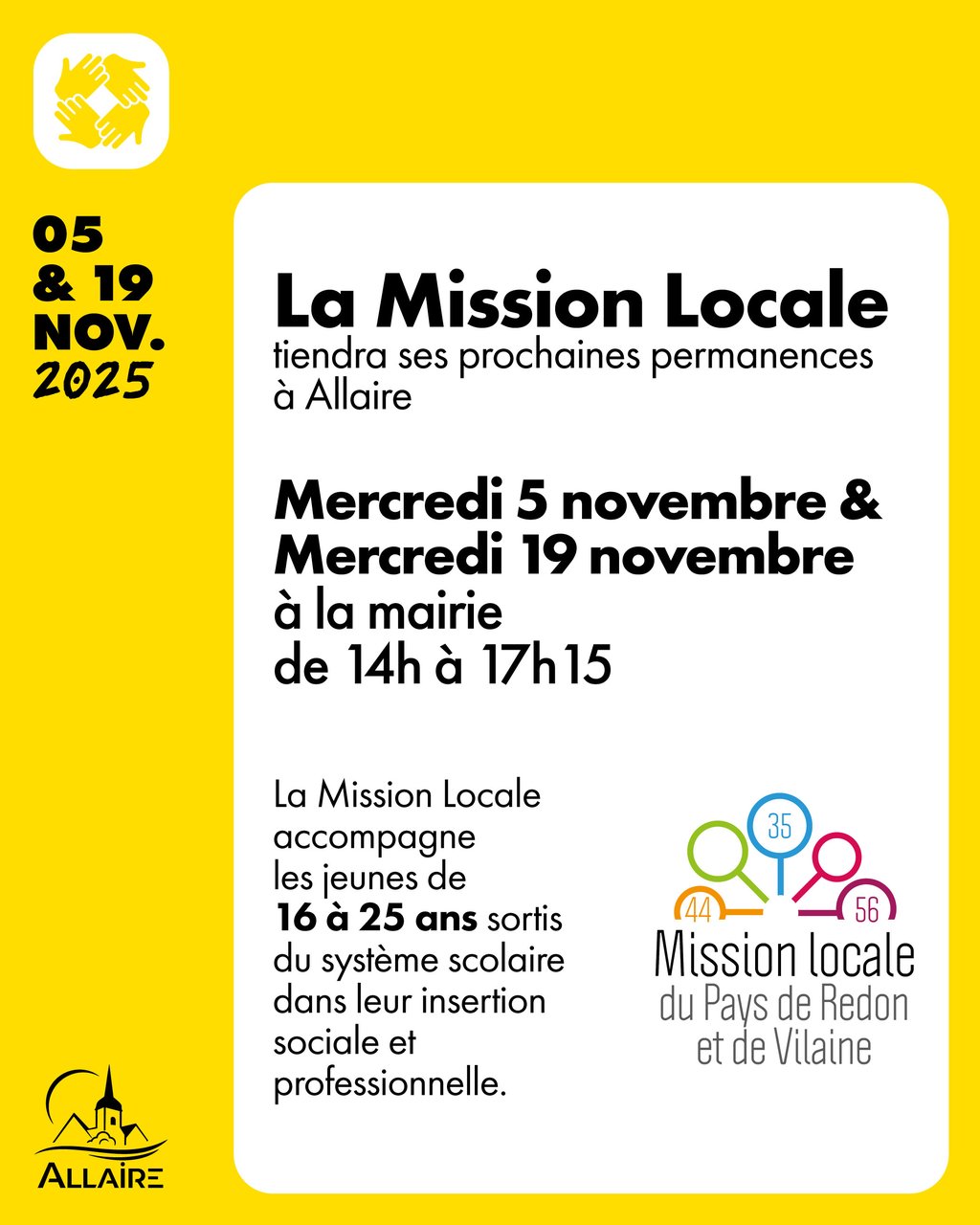 La Mission Locale tiendra ses prochaines permanences à la mairie d'Allaire les :