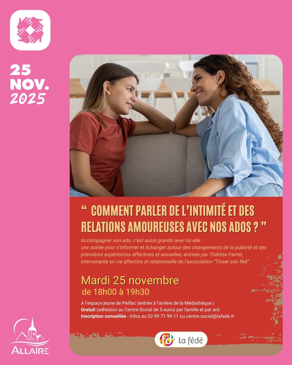 une soirée pour s'informer et échanger autour des changements de la puberté et des premières expériences affectives et sexuelles, animée par Thérèse Fravrel, intervenante en vie affective et relationnelle de l'association "Tisser son nid".