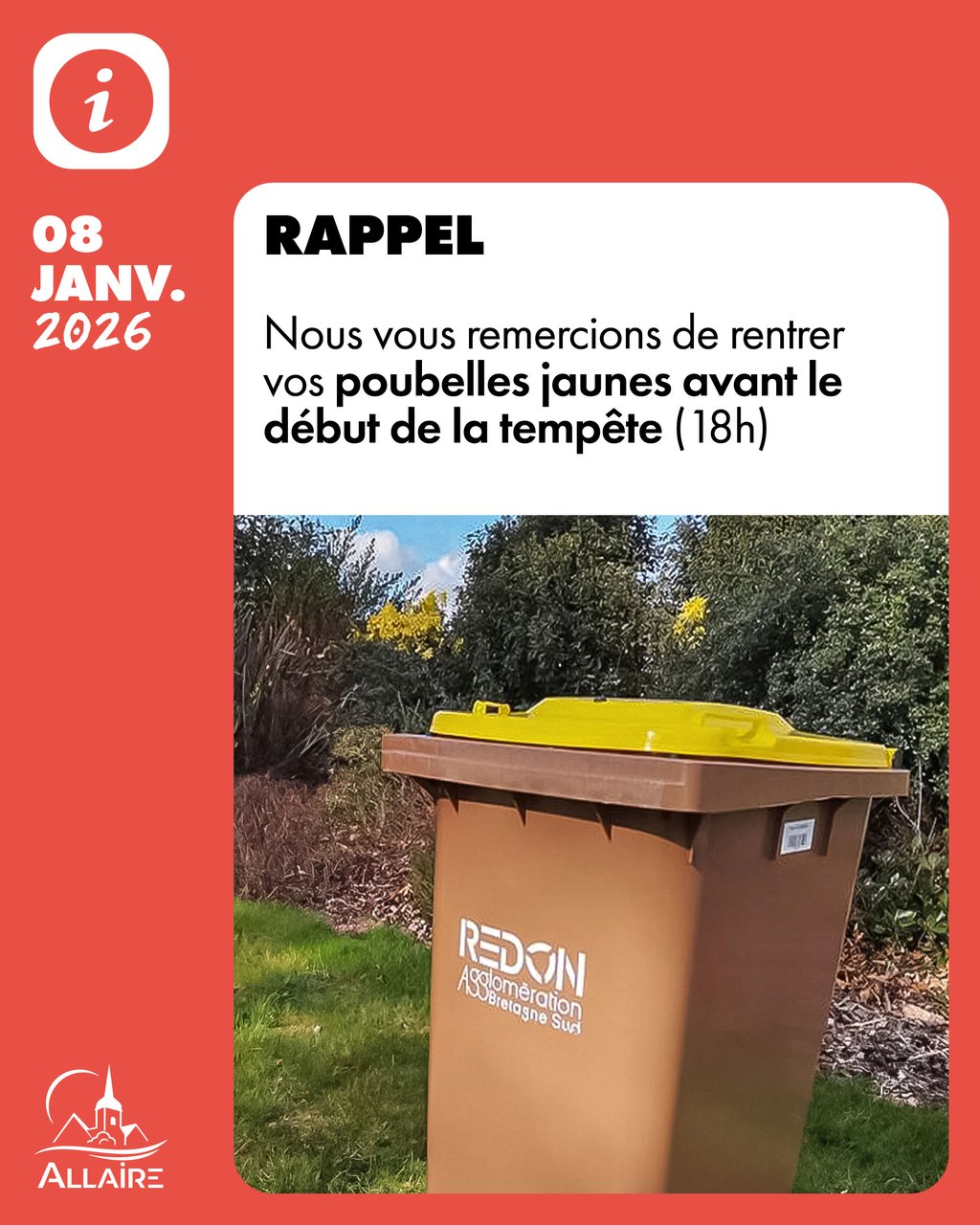 Nous vous remercions de bien vouloir rentrer vos poubelles jaunes avant le début de la tempête (prévue vers 18h).