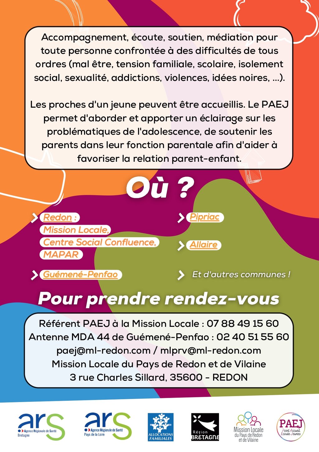 ➡️ Une permanence Point Accueil Écoute Jeunes (PAEJ) a lieu mercredi 21 janvier de 14h à 18h, au 2e étage du Centre Associatif à Allaire, 19 rue de Redon.