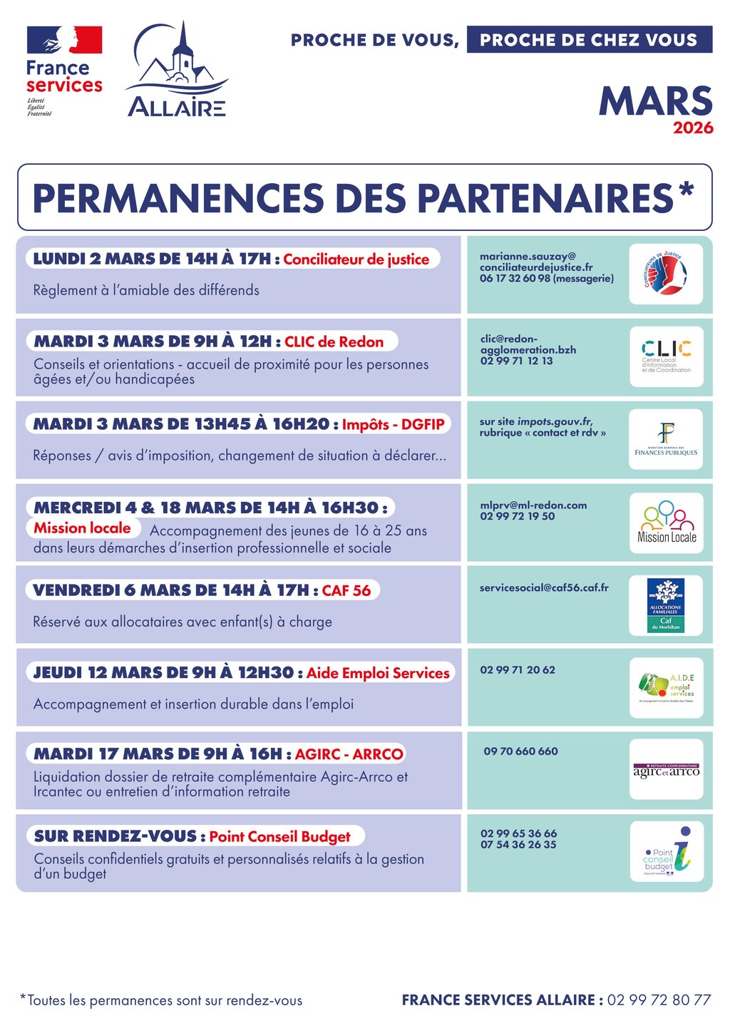 MARS 2026 : PLANNING DES PERMANENCES DES PARTENAIRES DE LA FRANCE SERVICES