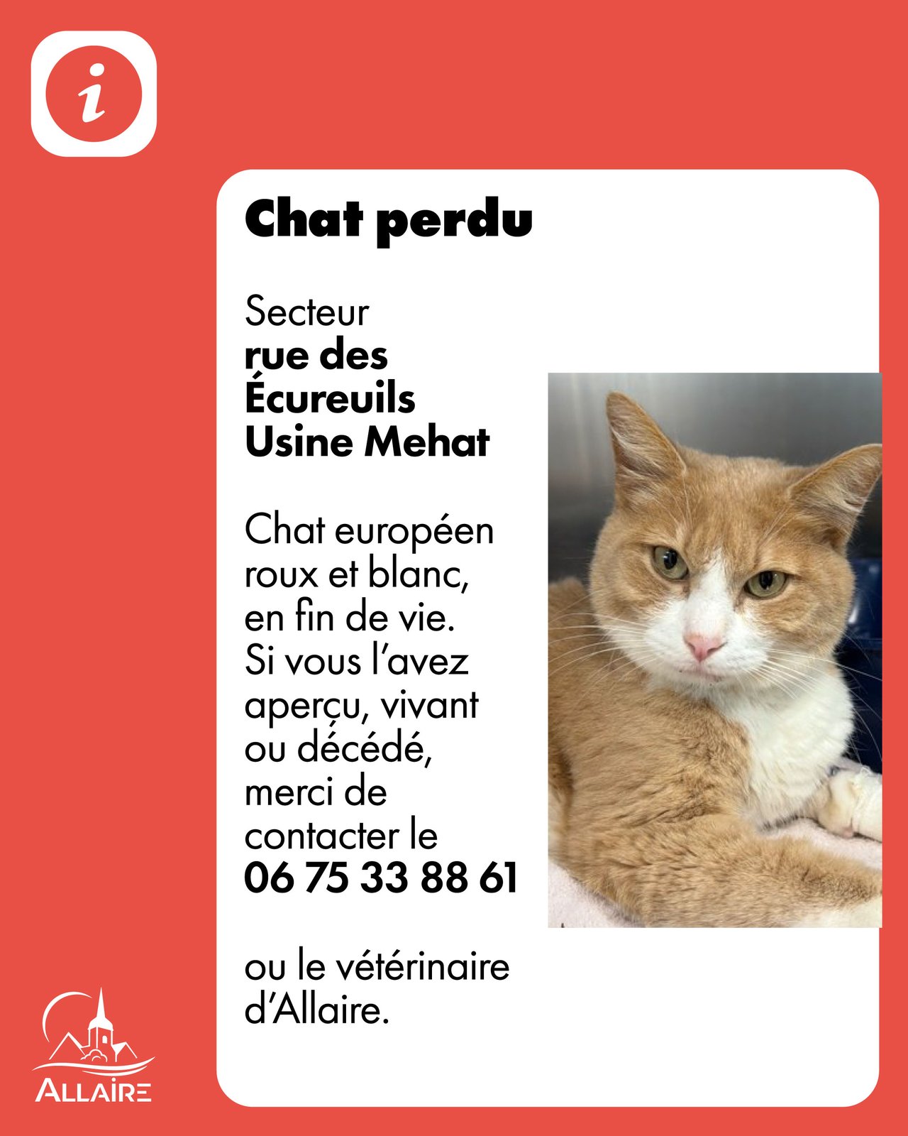 Si vous l’avez aperçu, vivant ou décédé, merci de contacter le 06 75 33 88 61 ou le vétérinaire d’Allaire.