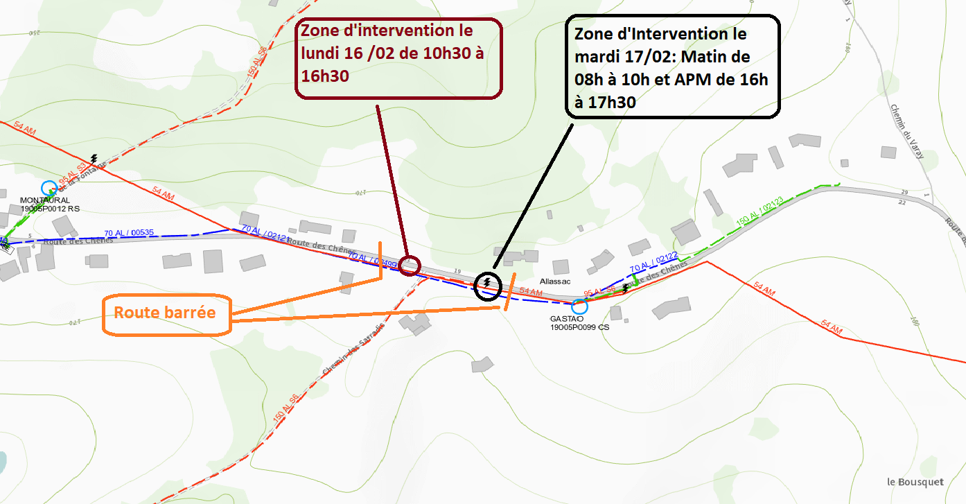 Dans le cadre de travaux de raccordement producteur et d’entretien du réseau par ENEDIS, la circulation sera interdite entre les n°11 et 19 de la route des Chênes, à Montaural (voir plan en pièce jointe). La route sera barrée aux horaires suivants :