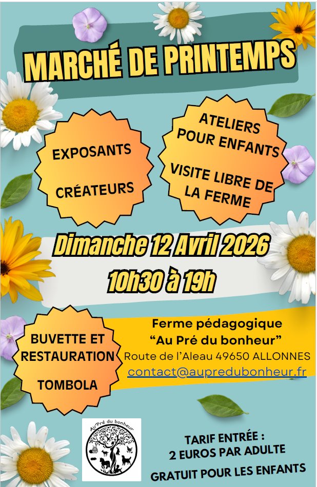 Marché de printemps de la ferme pédagogique "Au pré du bonheur" dimanche 12 avril de 10h30 à 19h / 2€ par adulte gratuit pour les enfants.