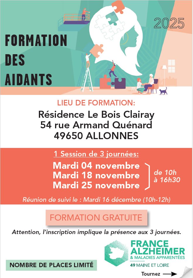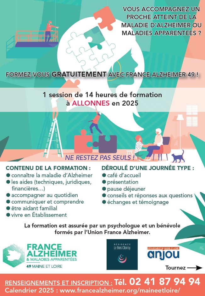 L’association France Alzheimer 49, organise une formation gratuite destinée aux aidants de personnes atteintes de la maladie d’Alzheimer ou d’une maladie apparentée.