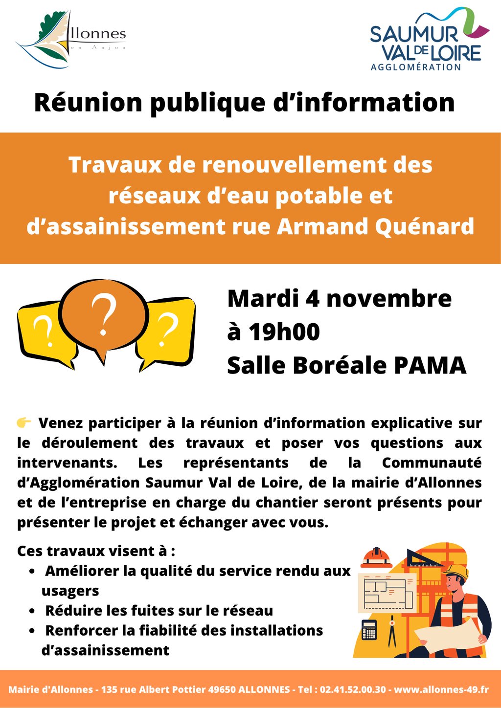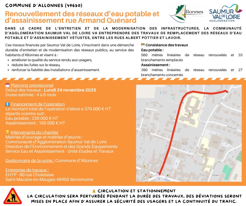 👉 Venez participer à la réunion d’information explicative sur le déroulement des travaux et poser vos questions aux intervenants. Les représentants de la Communauté d’Agglomération Saumur Val de Loire, de la mairie d’Allonnes et de l’entreprise en charge du chantier seront présents pour présenter le projet et échanger avec vous.