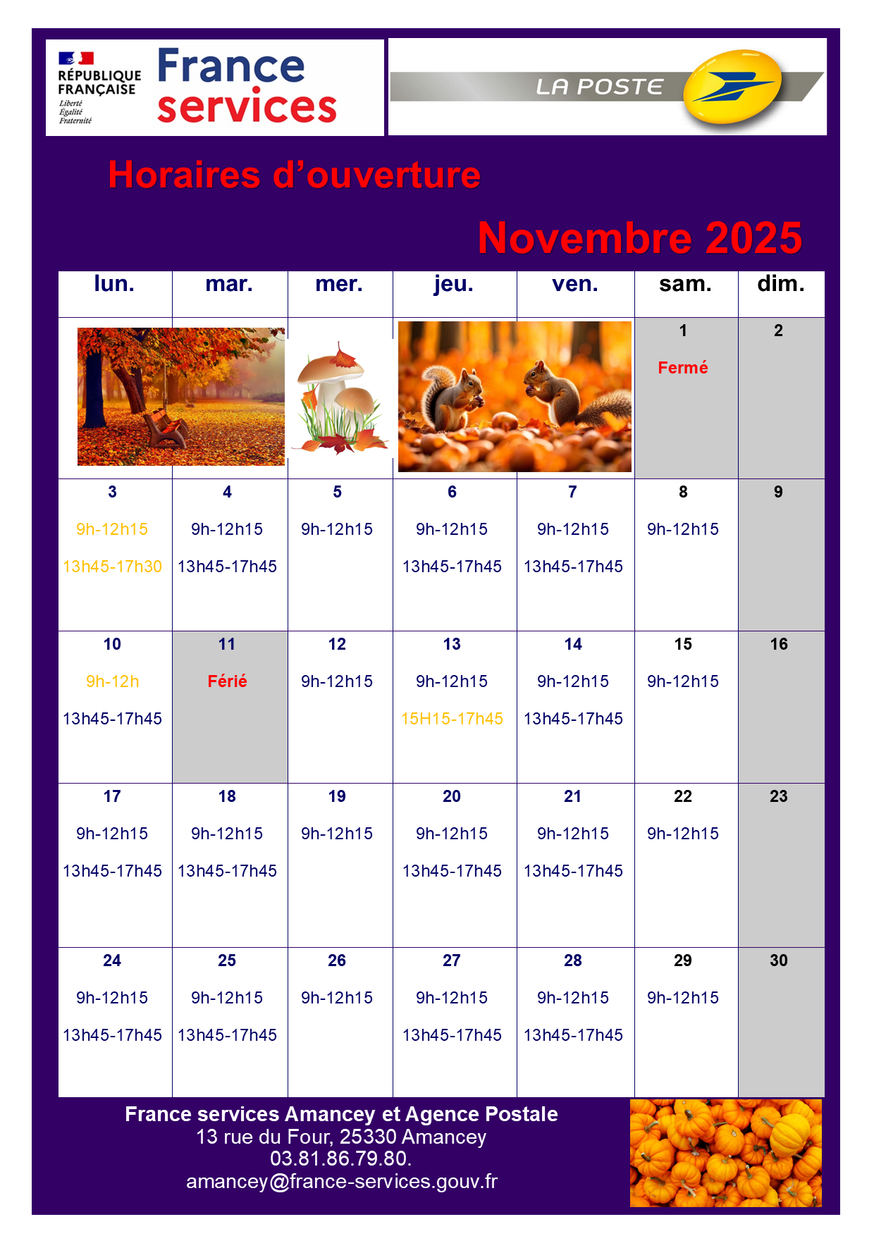HORAIRES D'OUVERTURES FRANCE SERVICES AMANCEY ET AGENCE POSTALE POUR LE MOIS DE NOVEMBRE