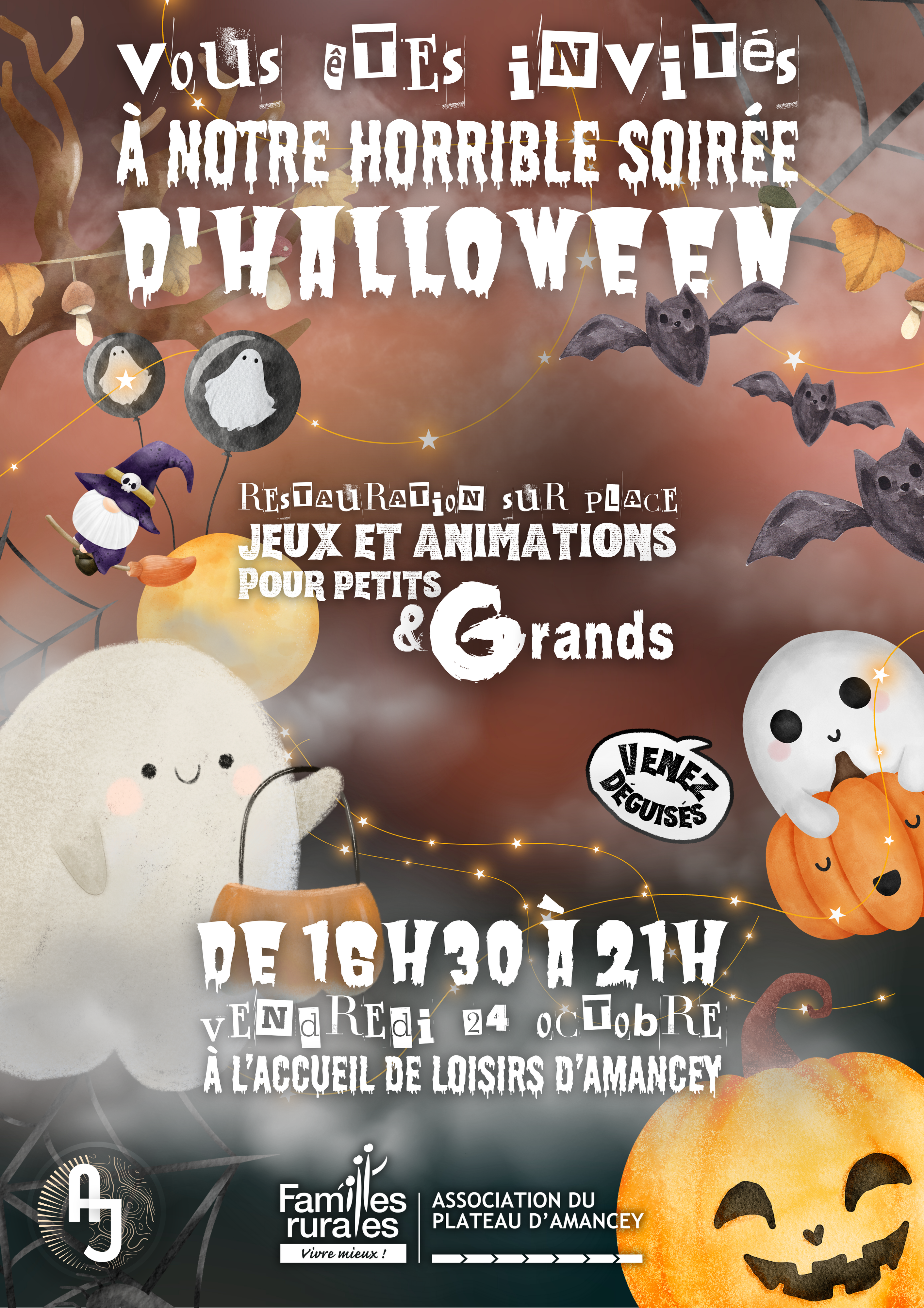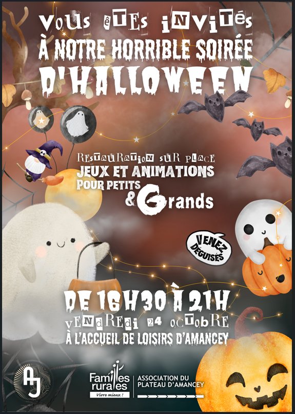 Le vendredi 24 octobre, les jeunes vous accueillent à leur soirée HALLOWEEN, à l'Accueil de Loisirs des Familles Rurales du Plateau d'Amancey !
