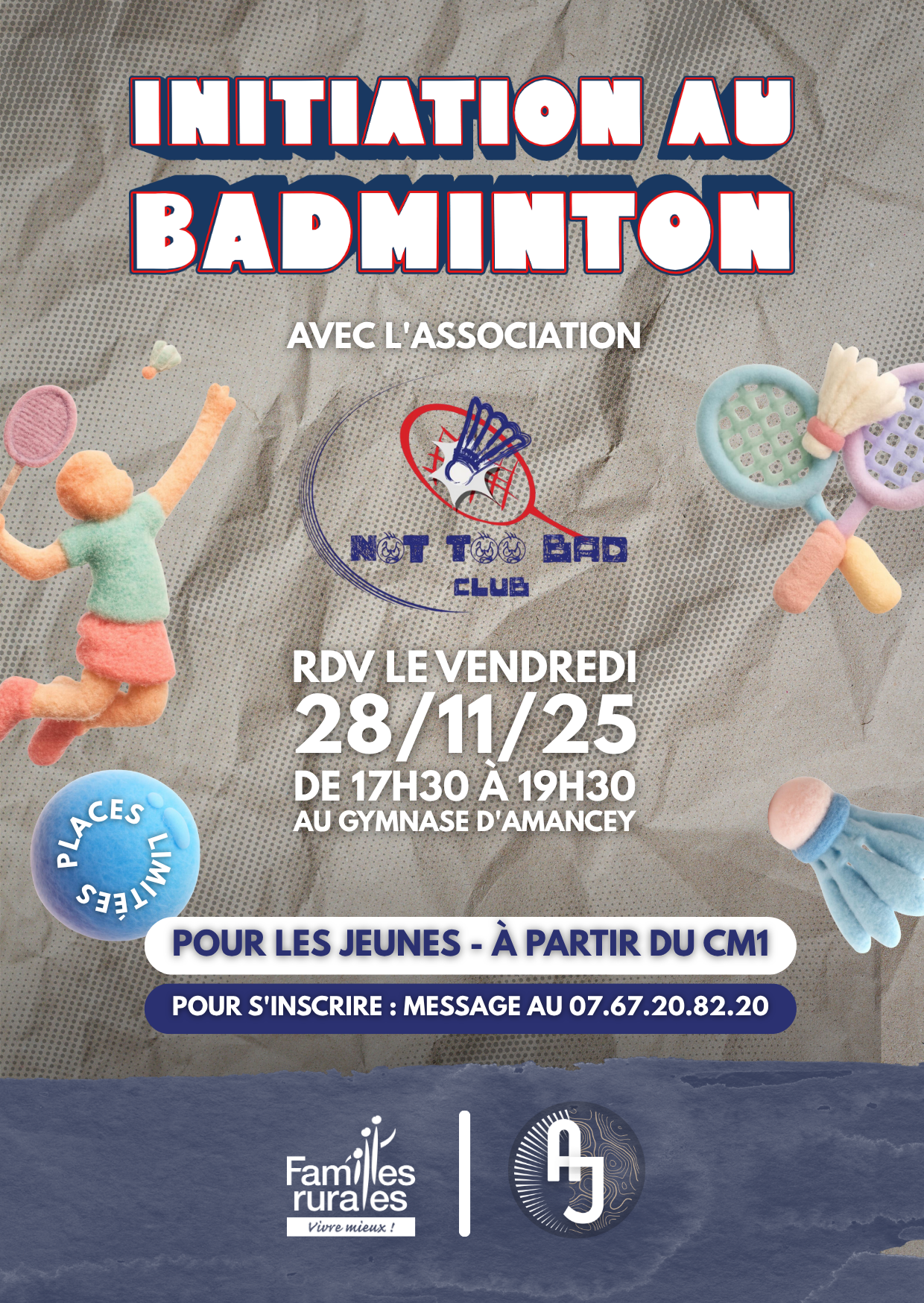 Familles Rurales, Action Jeunes et l'association Not Too Bad Club vous proposent une initiation au badminton pour les jeunes à partir du CM1. (maxi jusqu'a 18 ans)