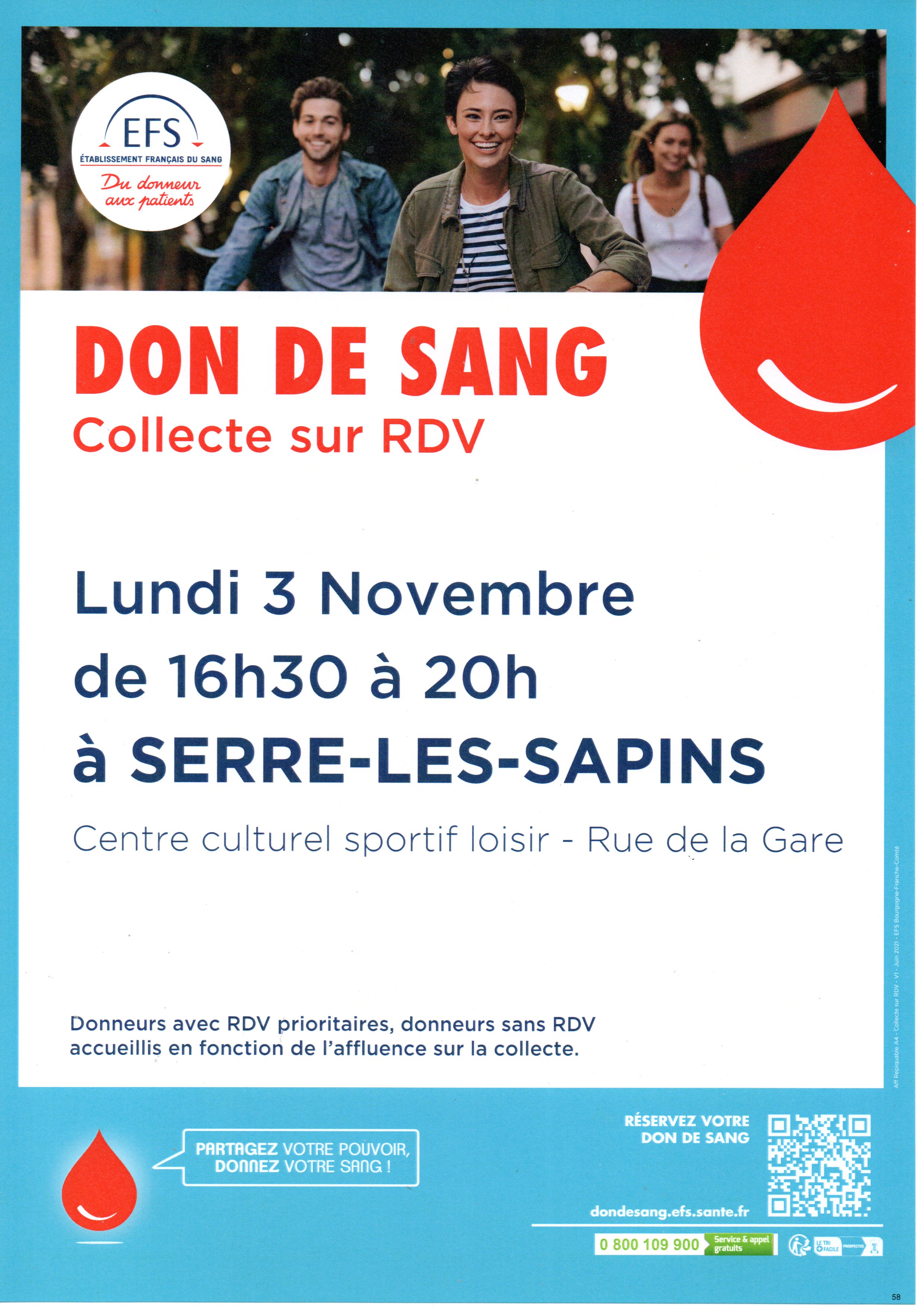 Nous vous donnons rendez-vous à Serre les Sapins, pour une nouvelle collecte de sang.