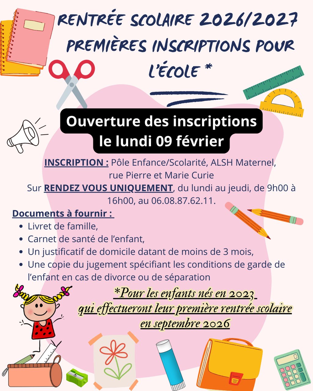 INSCRIPTION PRÉALABLE AU PÔLE ENFANCE/SCOLARITÉ : (sur rendez-vous uniquement de 9h00 à 16h00 𝙖̀ 𝙥𝙖𝙧𝙩𝙞𝙧 𝙙𝙪 𝙡𝙪𝙣𝙙𝙞 𝟬𝟵 𝙛𝙚́𝙫𝙧𝙞𝙚𝙧 𝟮𝟬𝟮𝟲, au 06.08.87.62.11. ou pole.enfance@ambazac.fr)