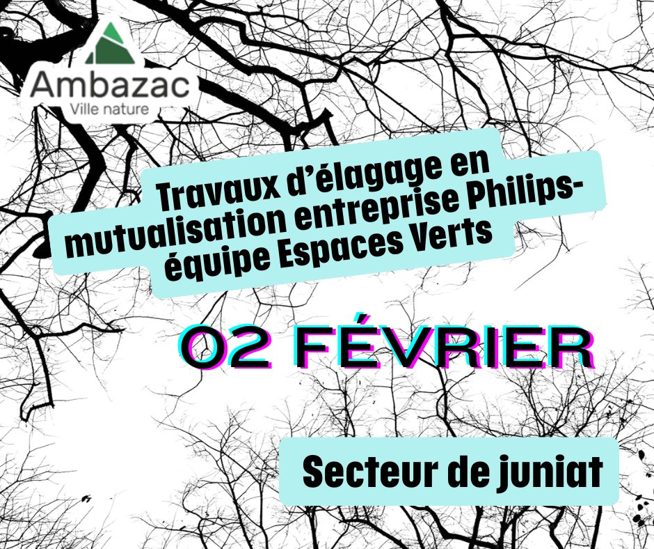 Travaux d’élagage en mutualisation entre l'entreprise Philips et l'équipe Espaces Verts , prévus le 26 janvier sur le secteur de Juniat, plus précisément route de Védrenne, (à partir de l’aire de covoiturage jusqu’à la route).
