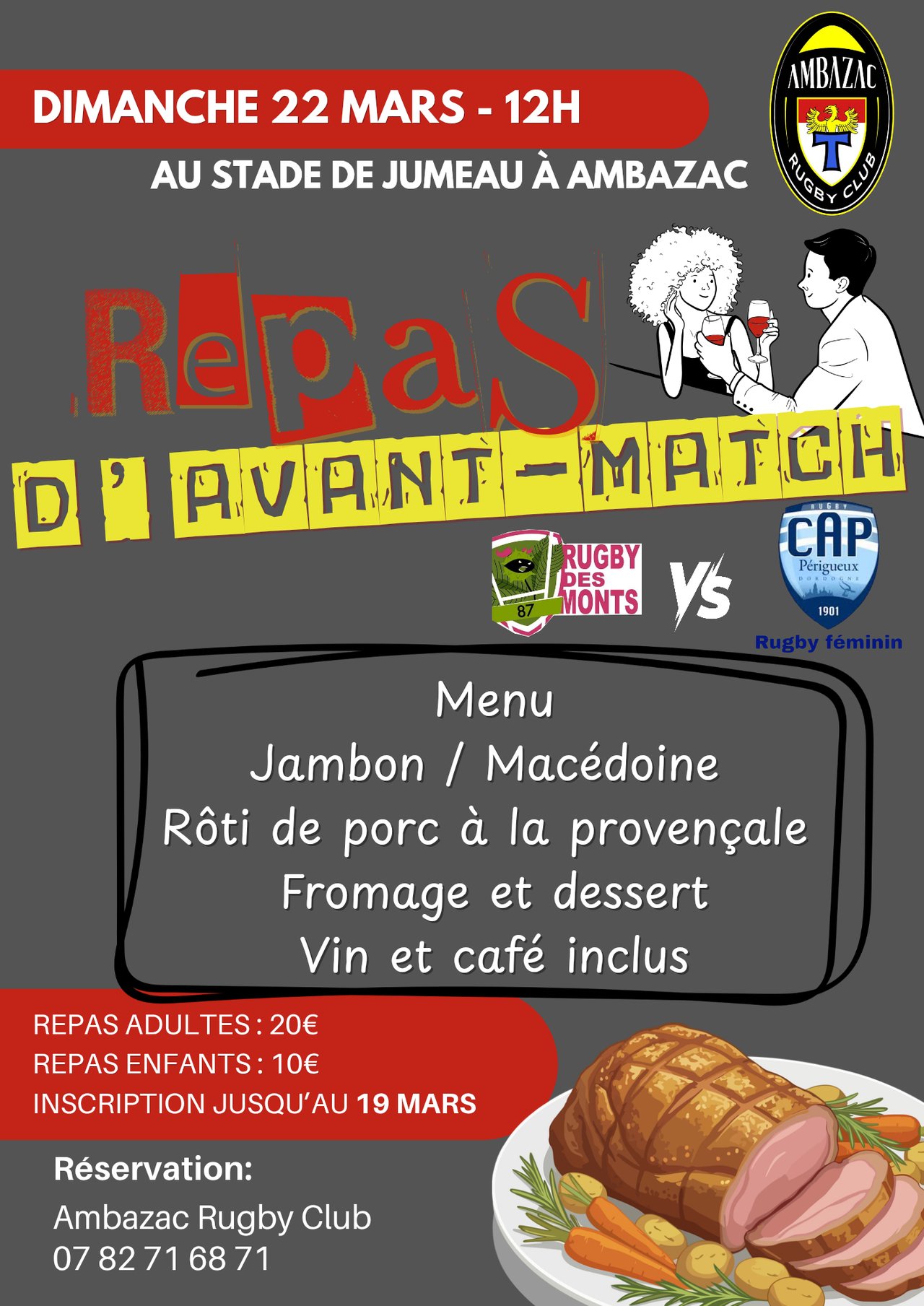 REPAS D'AVANT MATCH AVEC LES DÉMONES, À MIDI, DIMANCHE 22 MARS