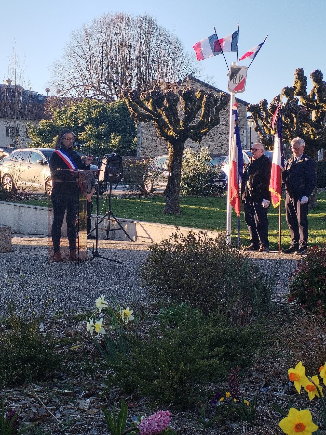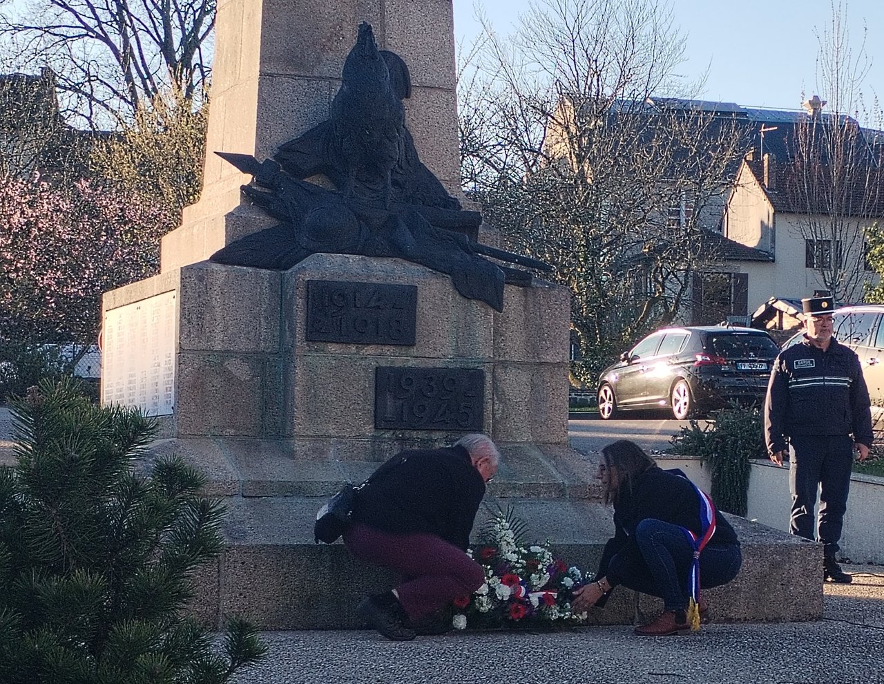 Hier, Mme le maire, des membres du Conseil Municipal, de la FNACA (Fédération Nationale des Anciens Combattants en Algérie, Maroc et Tunisie) et de l'ANACR (Association Nationale des Anciens Combattants et Amis de la Résistance), ont déposé la traditionnelle gerbe de fleurs au monument aux morts.