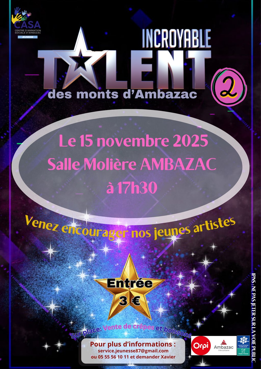 Que ce soit en chant, danse, magie, comédie ou toute autre discipline artistique, le Centre d'Animation Sociale Ambazac (CASA) organise la deuxième édition de l'Incroyable Talent des Monts d'Ambazac le 15 novembre 2025 à 17h30.