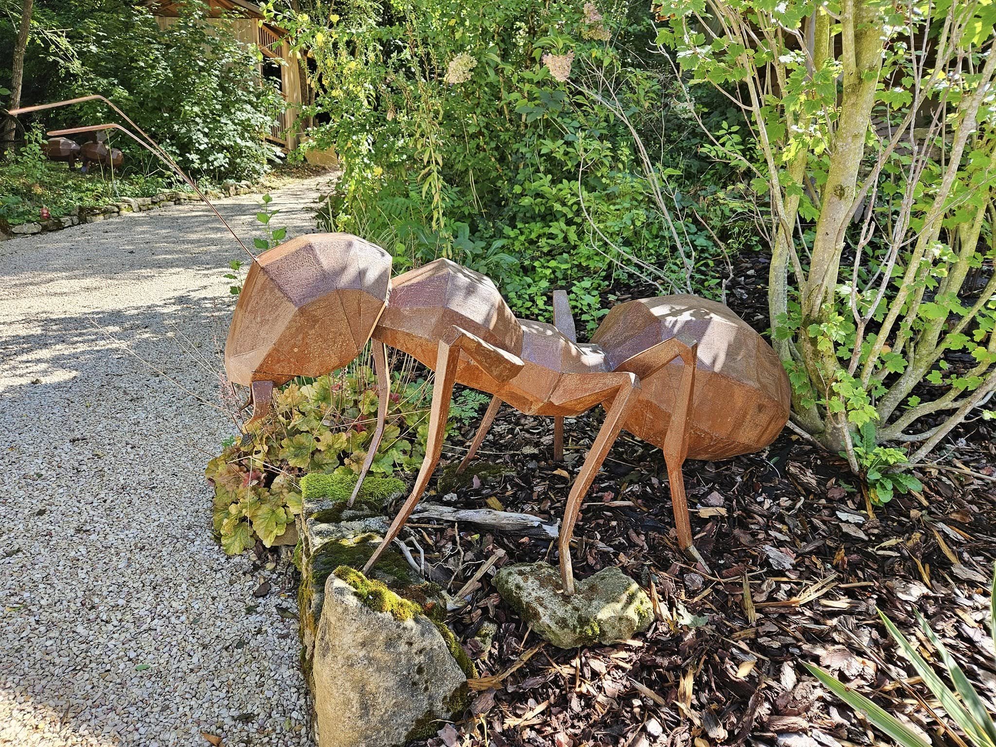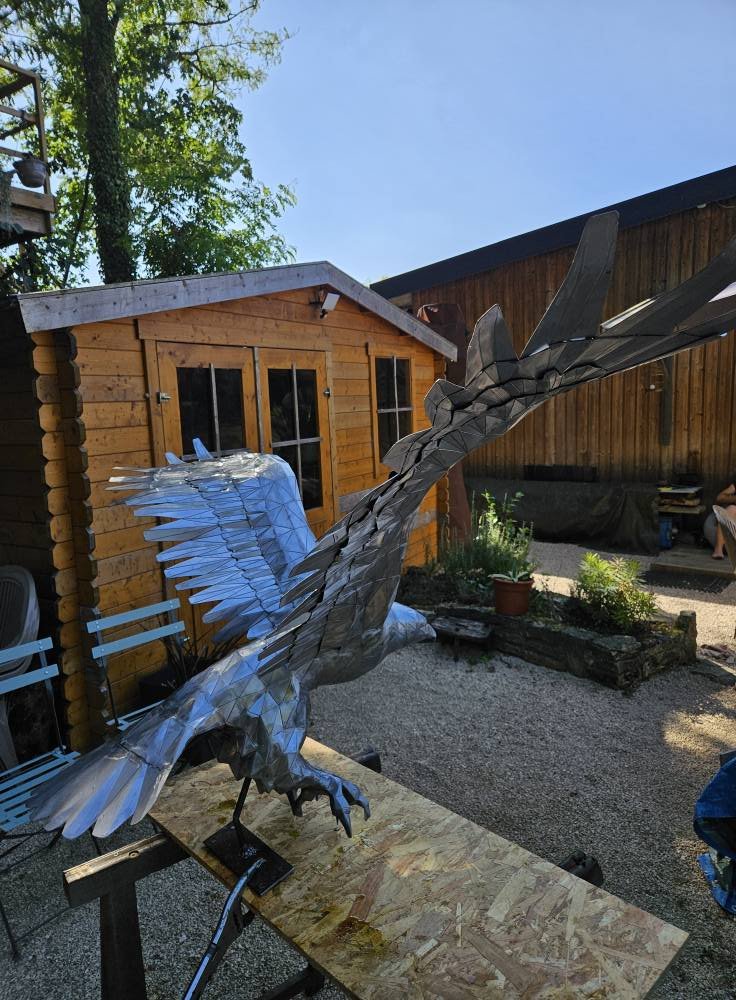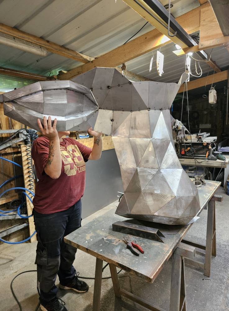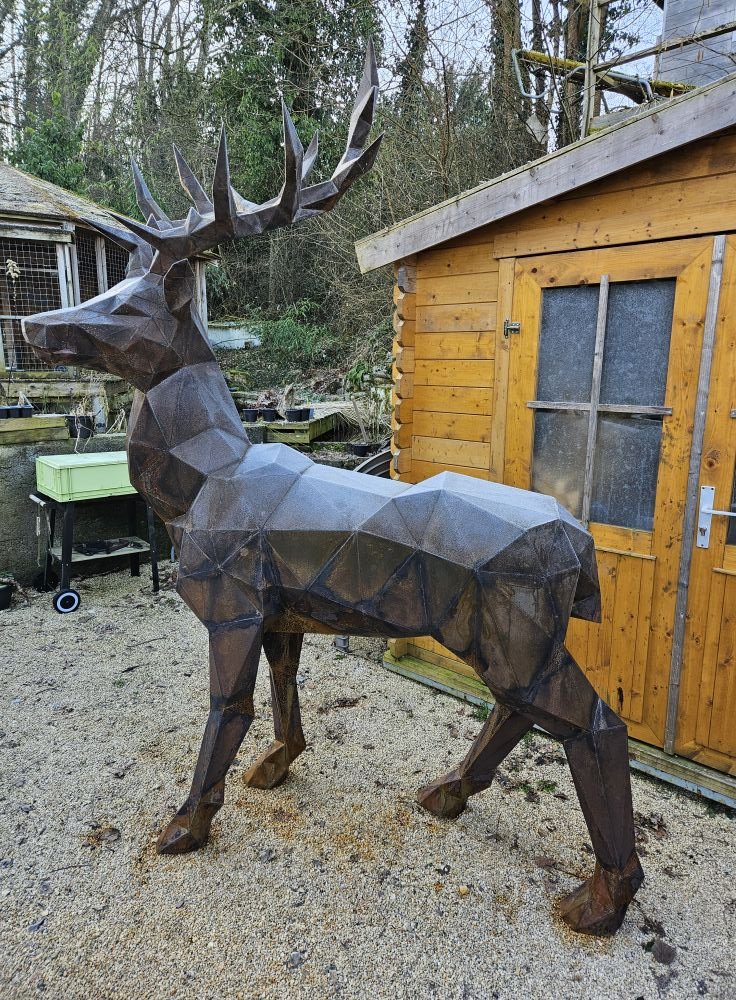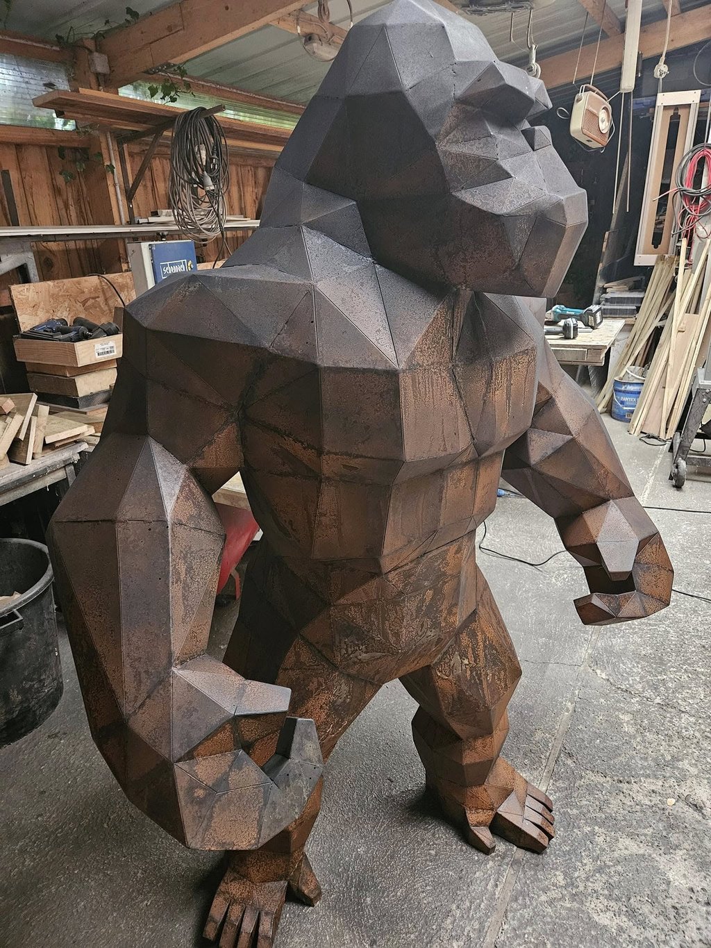 Sculpture en métal à l'aspect rouillé. Objets, animaux, bustes, personnages