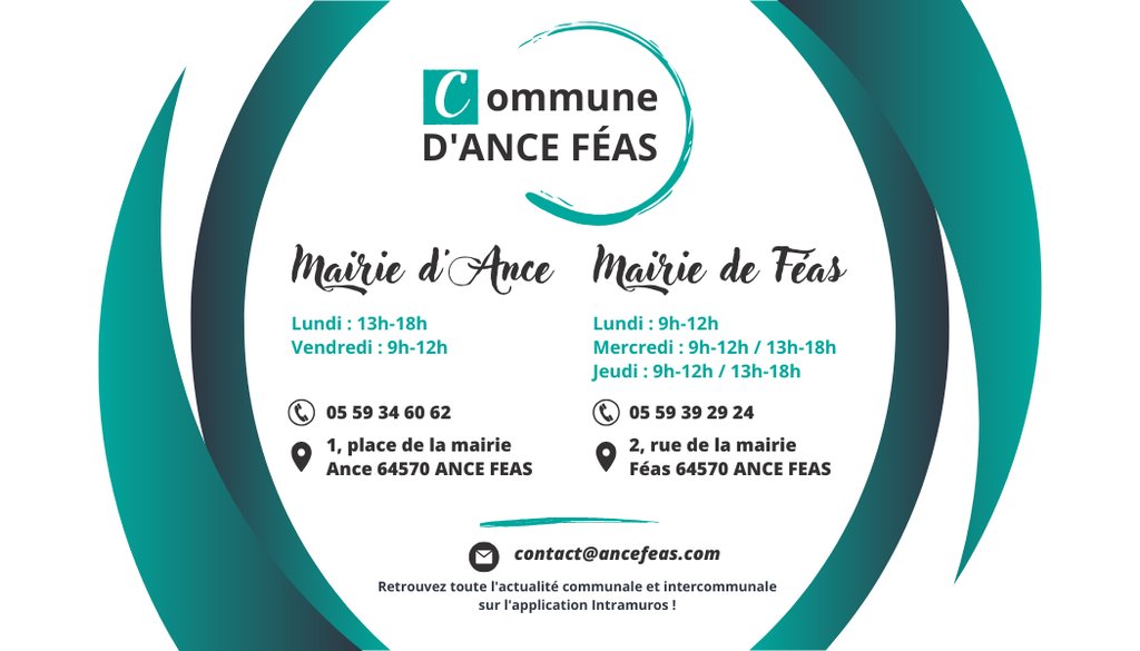 - MAIRIE DE FEAS : Lundi 9h-12h, Mercredi et Jeudi 9h-12h / 13h-18h.