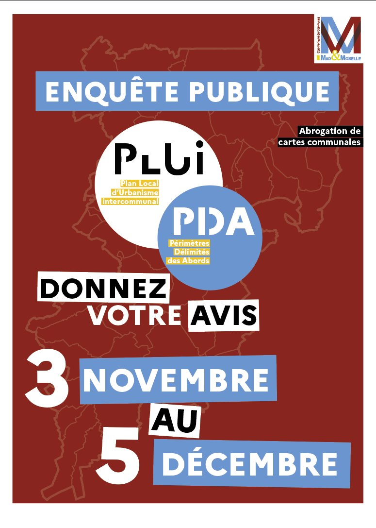 Du 3 novembre à 8h au 5 décembre 2025 à 12h, la Communauté de Communes Mad & Moselle organise une enquête publique unique relative au Plan Local d’Urbanisme intercommunal (PLUi), à la création de 14 Périmètres Délimités des Abords (PDA), et à l’abrogation de 2 cartes communales.