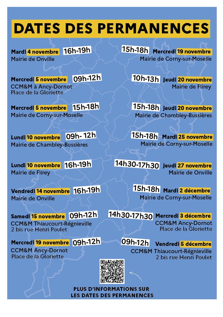 Les dossiers seront également disponibles sur un poste informatique mis à disposition dans les locaux de la CCM&M à Thiaucourt-Regniéville et Ancy-Dornot et dans les mairies des 47 communes, aux jours et heures d'ouverture habituels.