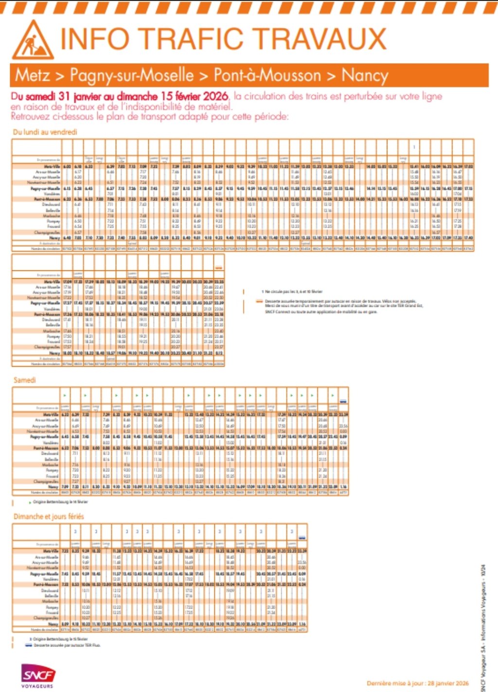 Affiche horaire travaux modifiée de la ligne L01A Nancy Pont-à-Mousson Pagny-sur-Moselle pour la période du samedi 31 janvier au dimanche 15 février 2026, en raison de l’indisponibilité de matériel.