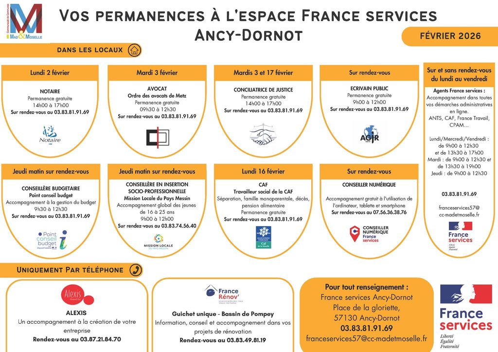 📅 Veuillez trouver le planning des permanences France Services à Ancy-Dornot pour le mois de Février.