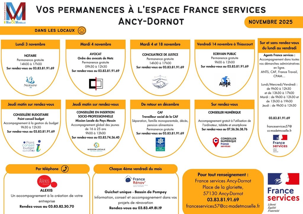 đ Les permanences France Services vous accueillent Ă Thiaucourt-RegniĂ©ville et Ancy-Dornot tout au long du mois.