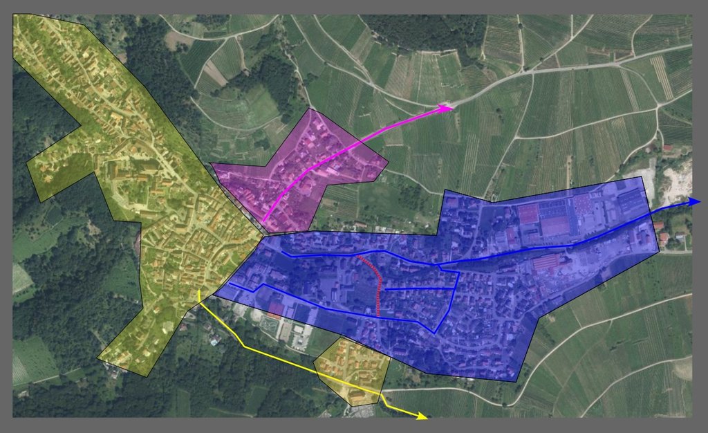 - Le bas d'Andlau, quartiers Cartors, Chalandon, Martiny, ZI, (en bleu) rejoignez la route d'Eichhoffen (flèche bleue) via la rue du Jasmin ou la rue Zone Industrielle.