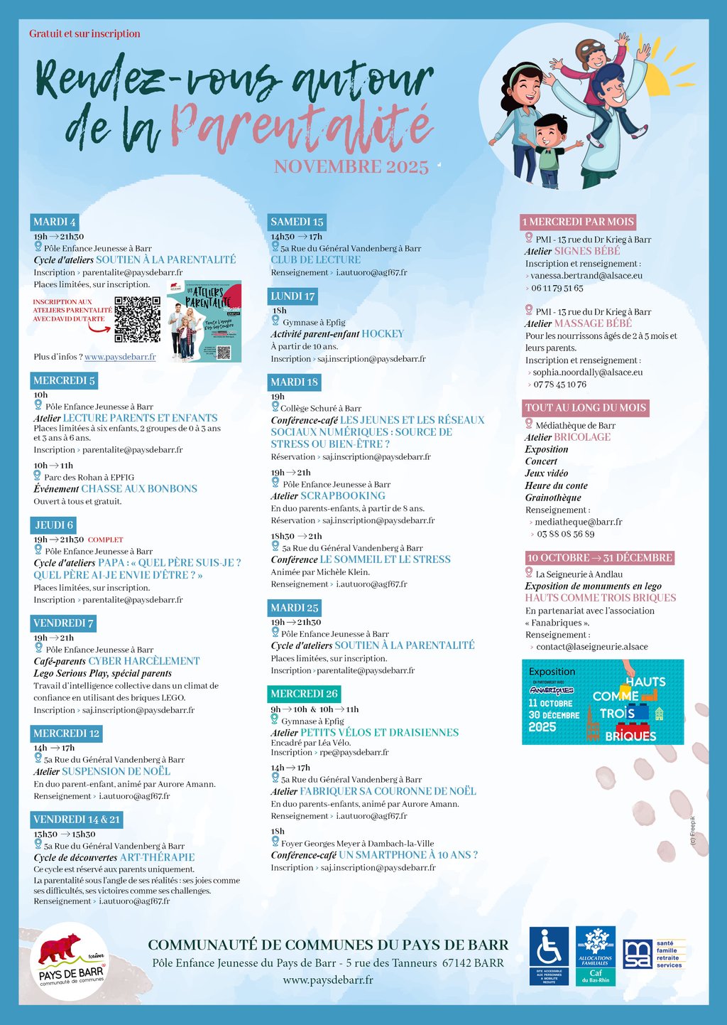 Le territoire du Pays de Barr est heureux de vous dévoiler son programme du mois de novembre : « Les rendez-vous autour de la parentalité », un ensemble d'événements pensés pour accompagner et soutenir les parents au quotidien.