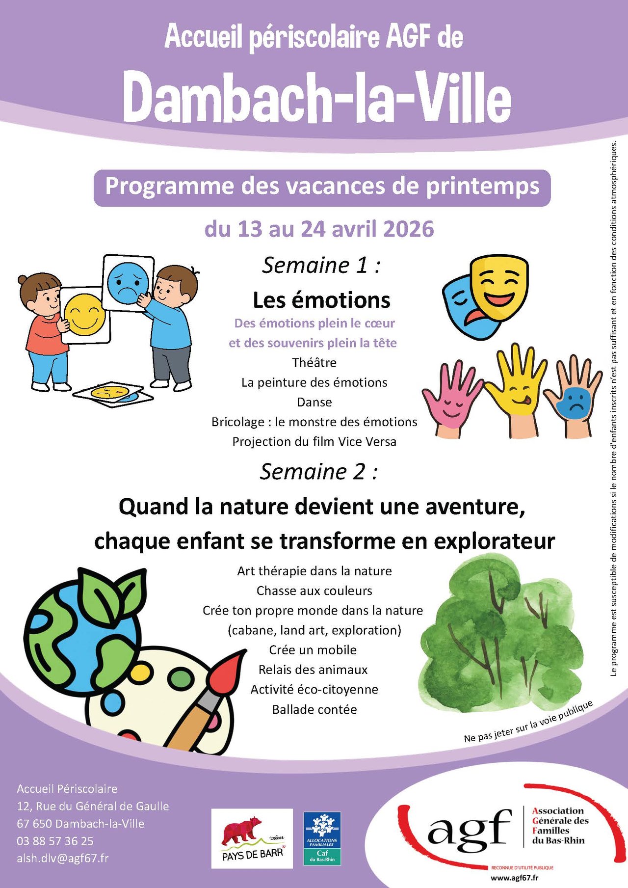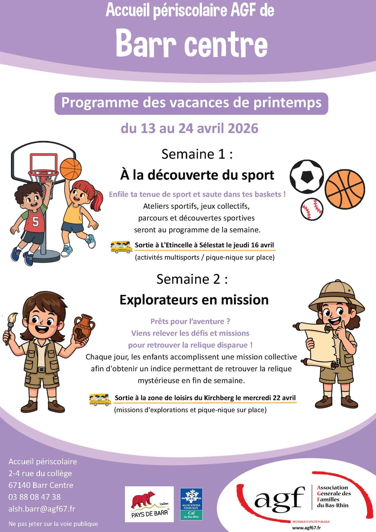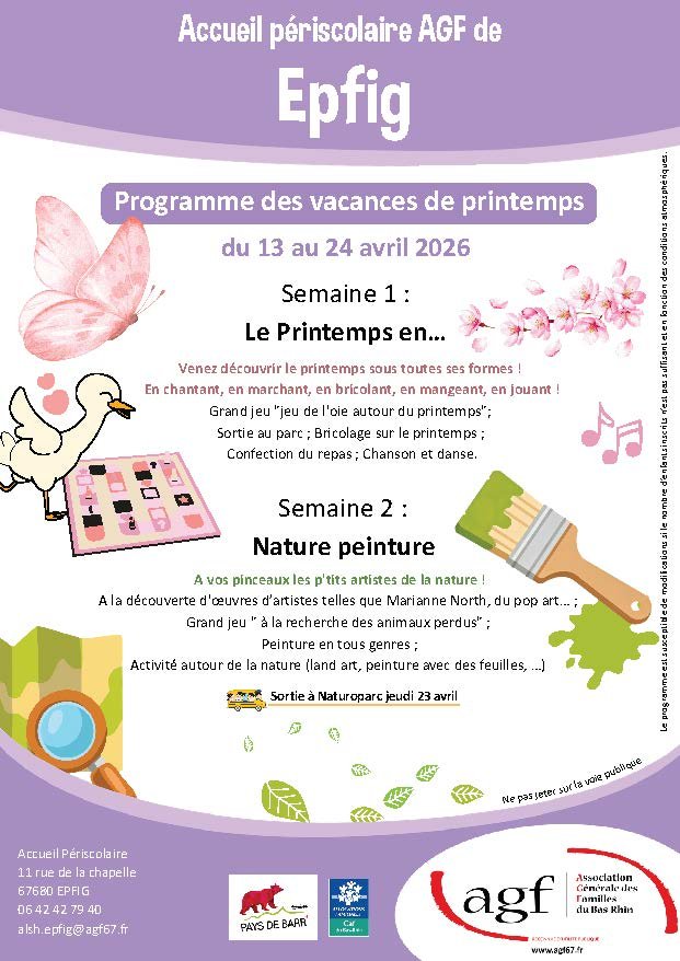 Du 13 au 24 avril, les accueils périscolaires de Barr Centre, Dambach-la-Ville, Epfig et Valff proposent un programme riche en découvertes et en aventures pour les enfants !