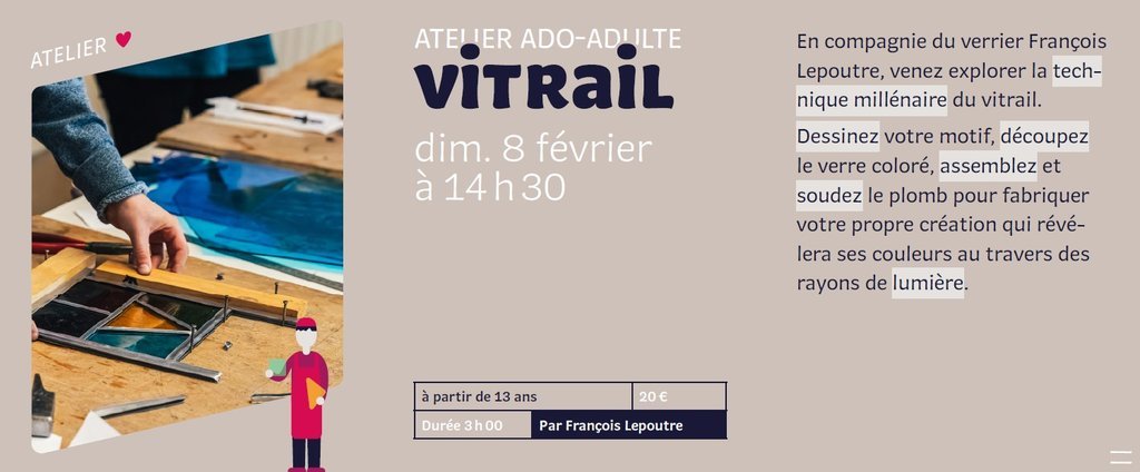 En compagnie du verrier François Lepoutre, venez explorer la technique millénaire du vitrail. Dessinez votre motif, découpez le verre coloré, assemblez et soudez le plomb pour fabriquer votre propre création qui révélera ses couleurs au travers des rayons de lumière.