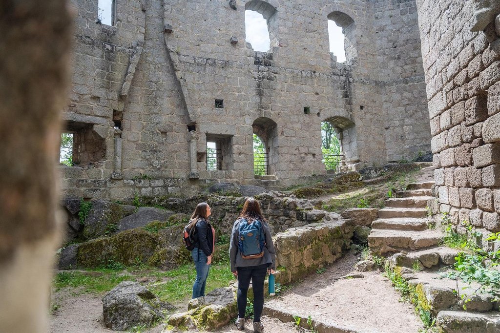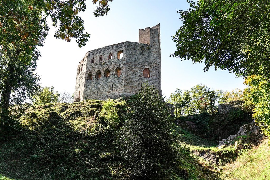 Construit en 1247 pour contrôler la vallée et l’abbaye voisines, le château possède un large donjon carré haut de 24 m et une cour intérieure. Des fragments de fresques polychromes sont visibles; avec les chapiteaux de cheminées sculptées, elles évoquent un raffinement peu connu au XIVème s.