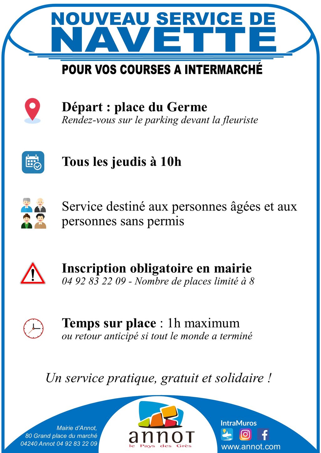 Vous ĂȘtes ĂągĂ©(e) ou sans moyen de transport ? La commune met en place une navette gratuite chaque jeudi matin dâAnnot vers ĂcomarchĂ© pour faciliter vos courses.
