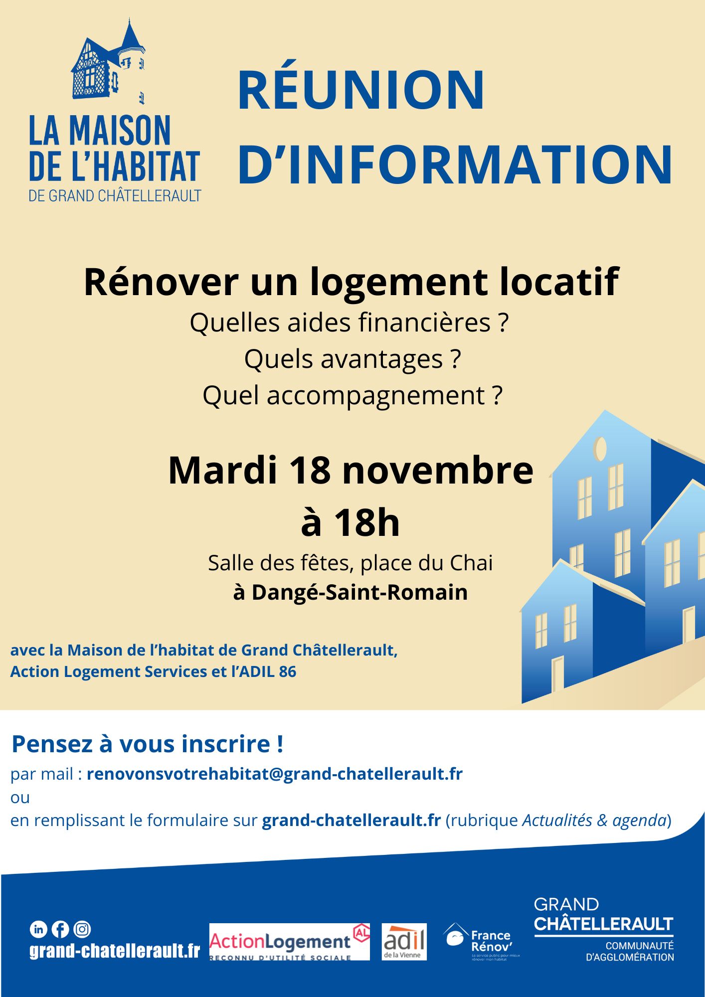 La Maison de l'Habitat Grand Châtellerault organise une réunion publique d'information destinée aux propriétaires bailleurs et investisseurs du territoire le Mardi 18 Novembre 2025 à 18 heures à la salle des fêtes de Dangé-Saint-Romain.