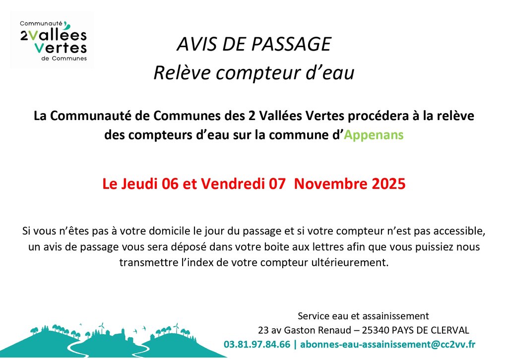 La relève des compteurs d’eau aura lieu du jeudi 06 au vendredi 07 novembre 2025 dans la commune d'Appenans.