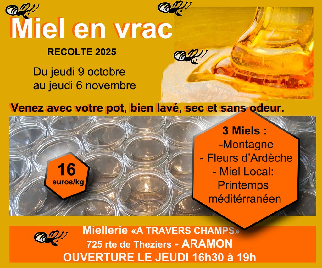 La miellerie A Travers Champs vous donne rendez-vous du jeudi 9 octobre au jeudi 6 novembre pour sa grande vente de miel en vrac 🐝