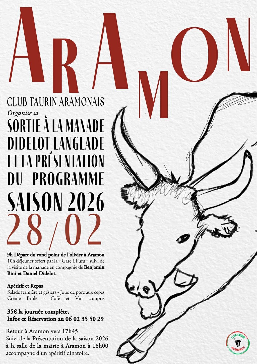 Le Club Taurin Aramonais a le plaisir de vous présenter son affiche pour sa traditionnelle sortie hivernale suivie de la présentation de la saison 2026.